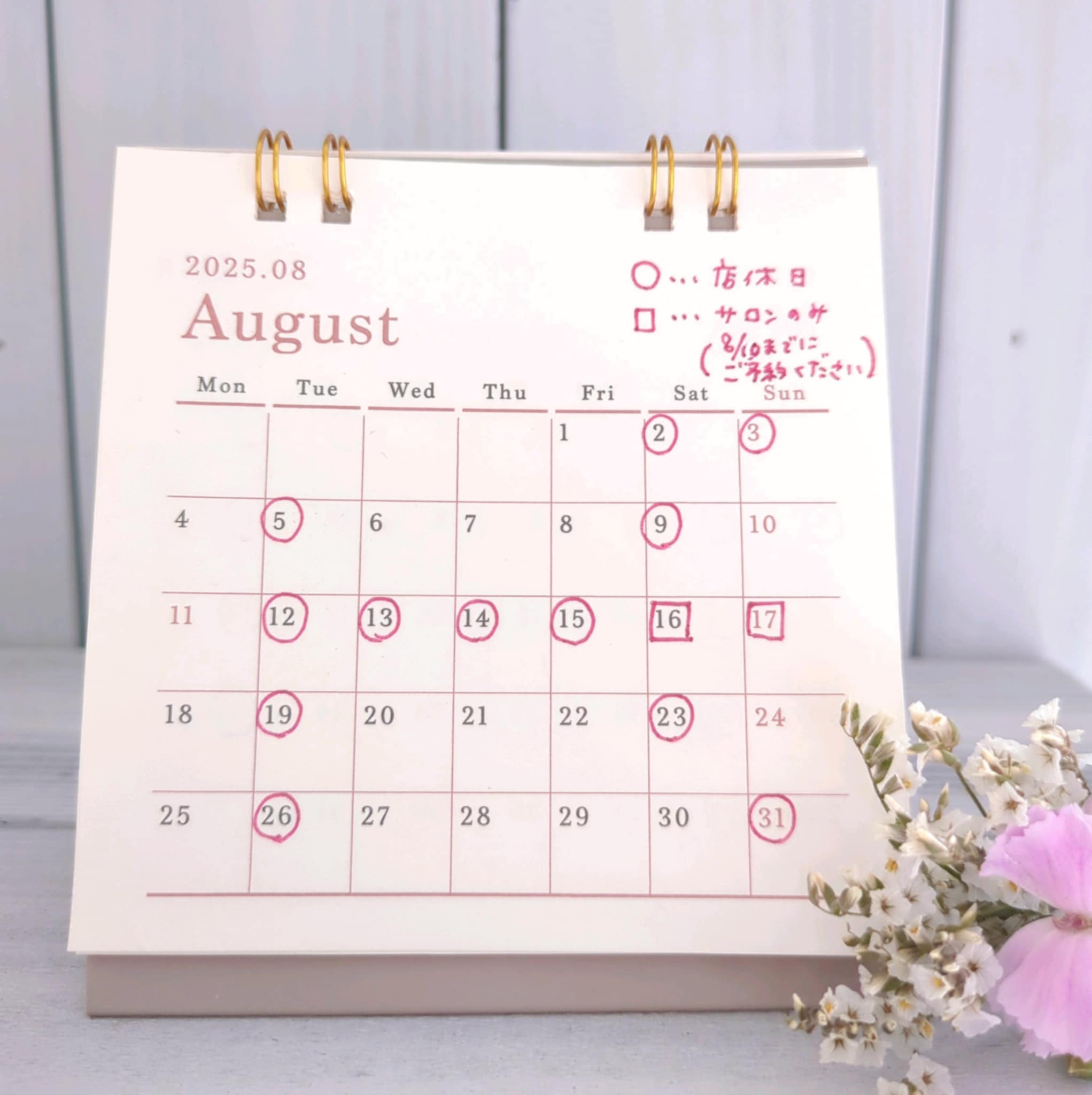 8月の予定です。(変更する場合もあります)今月もよろしくお願いします☺◎お休み◎2(土)、3(日)、5(火)、9(土)、12(火)~15(金)、19(火)、23(土)、26(火)、31(日)*16(土)、17(日)はサロンのみ営業します。10(土)までにご予約をお願いします。◎定休日◎火曜…